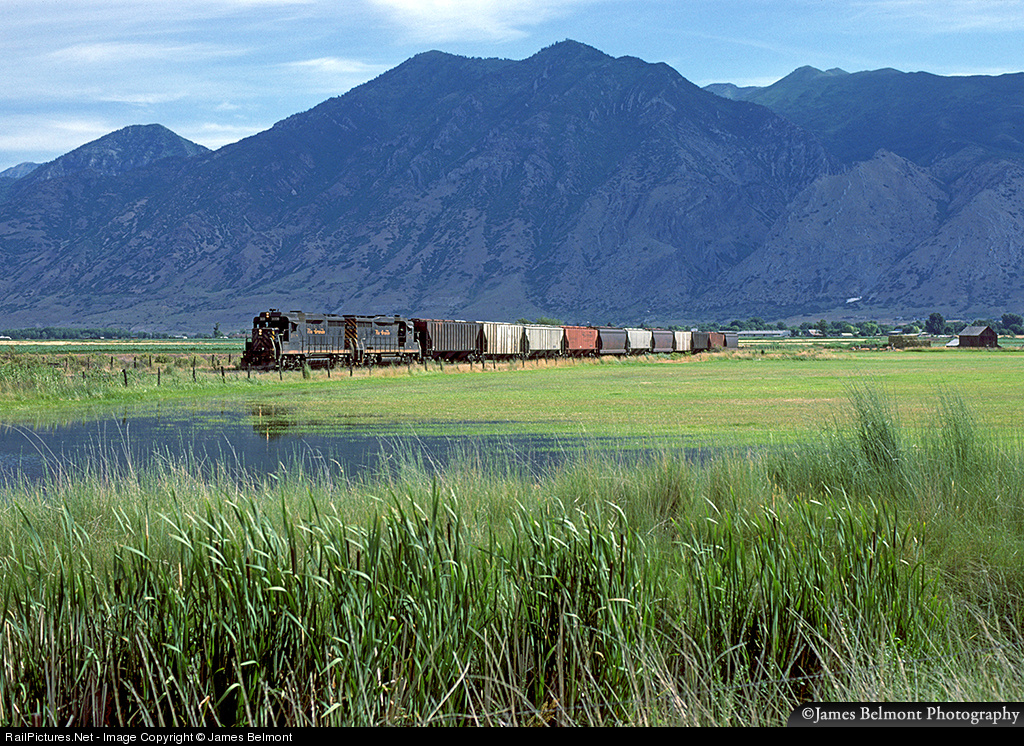 Rio Grande's Provo Switcher rambles slowly through farm fields with 11 cars of Moroni turkey feed for transloading to semi trucks at Spanish Fork Sugar Factory. Today this rural retreat hosts a big housing development.