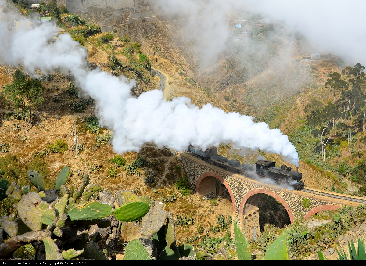 | This picture of the 442 54 crossing this beautiful viaduct near Asmara was the last sunshine shot of the day. A few minutes later the fog arrived and all the cameras returned to their bag for the rest of the day. |