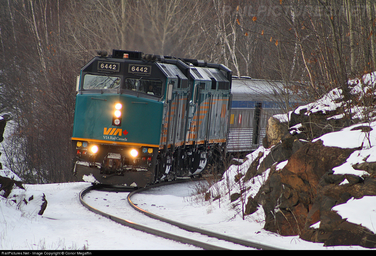 | VIA 6442 rounds the bend leading VIA 2. The train was 5 hours late due to a breakout of flu in the sleeper cars, 4 people affected by it and 1 person had died on the train. The other 3 were taken to hospital and the cabins were quarantined. |