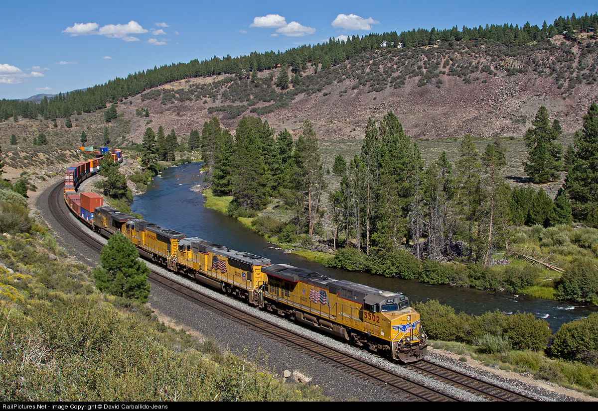 Four UP locomotives tackle one of its most famous route, Donner Pass. Two ES44AC and two SD70M are in control of a North Platte, NE to Oakland, CA high priority intermodal train as the follow the Truckee River to Truckee and over the Sierra Nevada Mountain Range.
