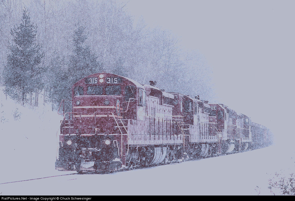 Rolling east at a steady 30mph near Hannahville the DMIR 315,170,209,312 and 90 loads of Minorca ore are fighting through a fairly heavy Upper Michigan snow squall. Most years these winter only Minorca-Escanaba trains tended to use WC power for the most part, but during the winter of 96 the WC was extremely power short and instead of the usual SD45/F45 sets with the rare DMIR unit mixed in solid sets on DMIR's could be found.