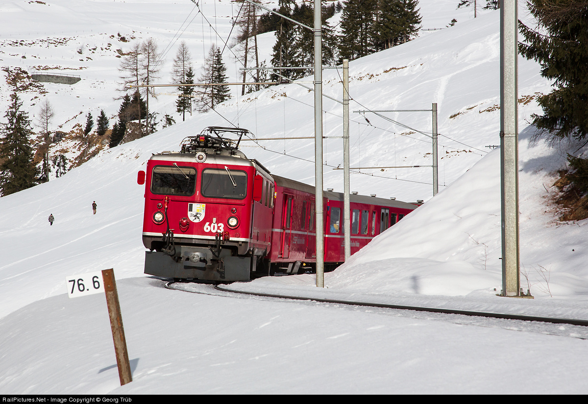| Ge 4/4 I # 603 of the Rhätische Bahn with train 829 from Bergün to Preda on the uppermost level of the loops of Bergün. The train serves for the many sledgers who run down from Preda to Bergün on the prepared sledge run. The locomotive was built in 1947 and is more then 65 years in service now. The cabs were built new about 20 years ago. |