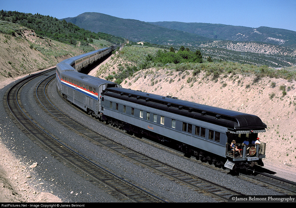 American author/photographer/historian Lucius Beebe's 'Virginia City' Pullman observation car takes a tour of the Denver & Rio Grande Western coupled to Amtrak's California Zephyr train #6 at Gilluly, Utah.