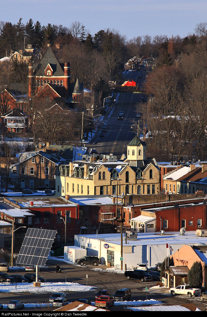 The red cab of CN 2175 pops out from the trees surrounding the small town of Paris, Ontario which is situated in the bottom of a river valley.