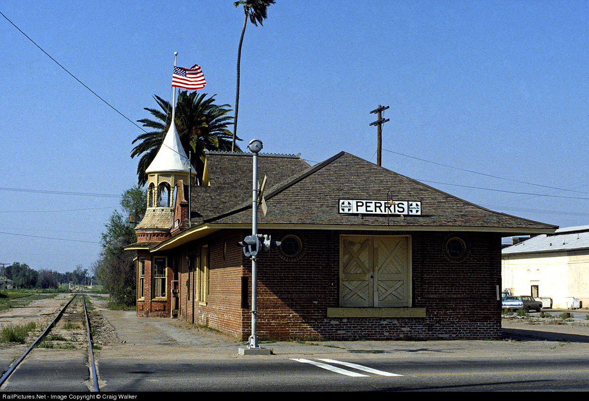 We'll Always Have Perris... Constructed in 1892 by the California Southern Railroad, the station in Perris, California, was built in the Queen Anne architectural style. This line was originally part of a proposed transcontinental line, but the southern end of the line, heading to San Diego, was repeatedly washed out and the city of Perris was no longer a junction, but rather just another stop on what would become the Santa Fe Railway's San Jacinto Branch. A short section of the old California Southern remains, and is today the rail line to the nearby Orange Empire Railway Museum.