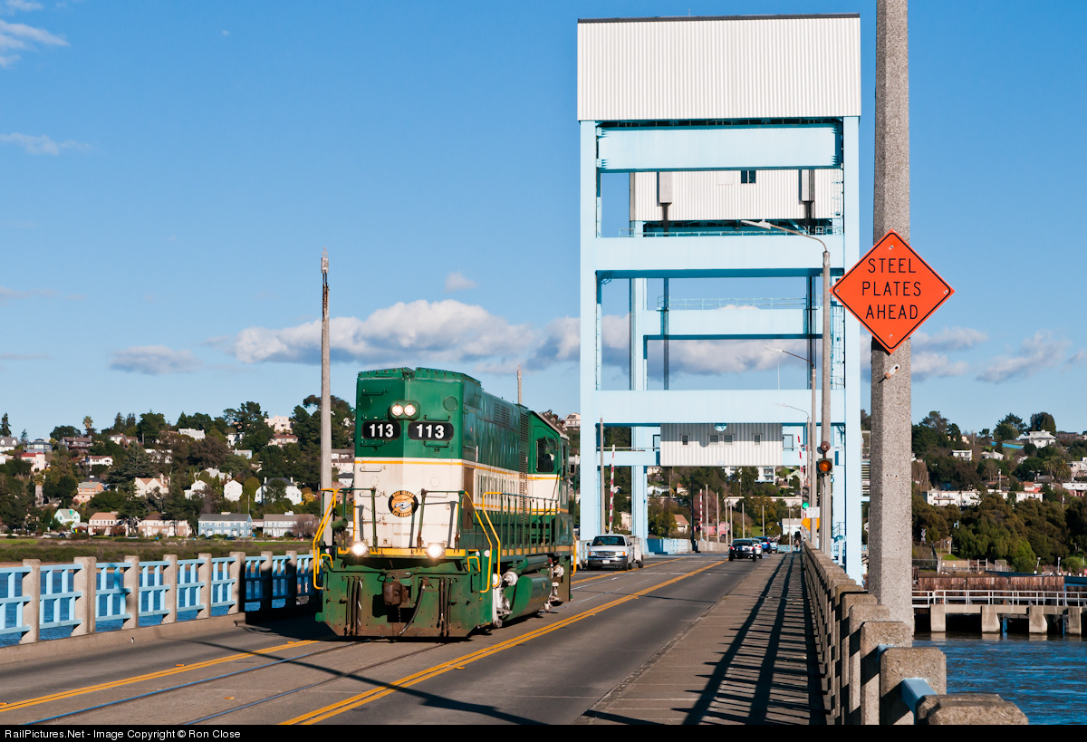 Operating days numbered, MIRS 113 runs light westbound across the causeway between Vallejo and Mare Island. The Mare Island Rail Service (owned by Tri-City & Olympia Railroad) evacuated all of their equipment from the island before the Dec. 31, 2012 deadline imposed by landowner / developer Lennar Mare Island, LLC after their contract was cancelled.