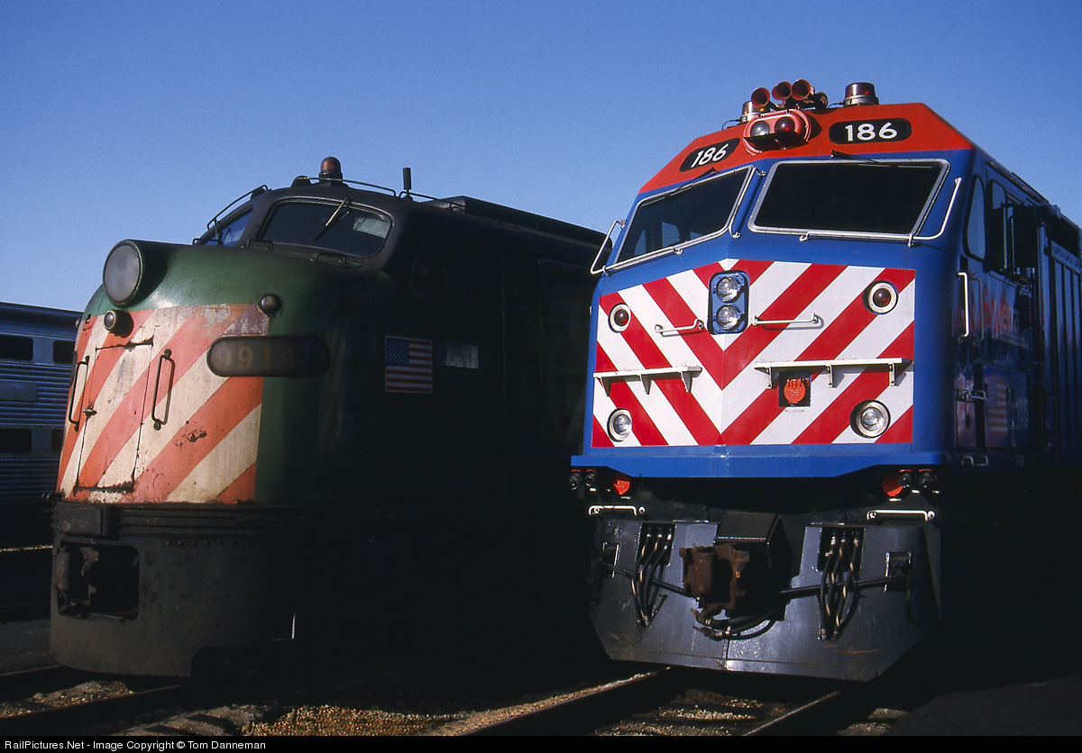 Which face do you prefer? Three-month-old Metra F40PHM-2 sits alongside its 35-year-old big brother, Burlington Northern E9AM 9914. The E didn't even make it until the end of the year before the 186 and other F40PHM-2s took over most of BN's commuter operations.