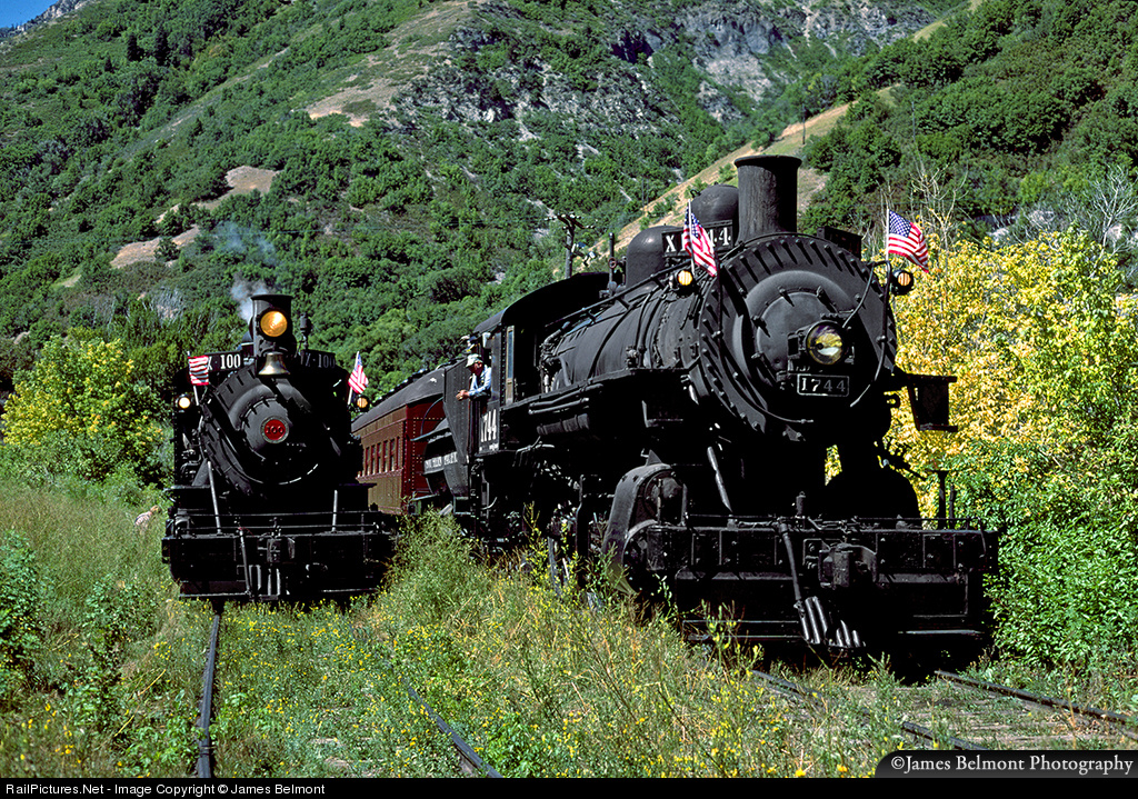 | Deer Creek Scenic Railroad's tradition of running doubleheaders on Memorial Day and Labor Day weekends continued in the 1980s. Santa Maria Valley #100 (blt. by Baldwin in June 1926) and Southern Pacific 4-6-0 #1744 (blt. by Baldwin in Nov. 1901) receive a little TLC at the Vivian Park turnaround point in beautiful Provo Canyon. |