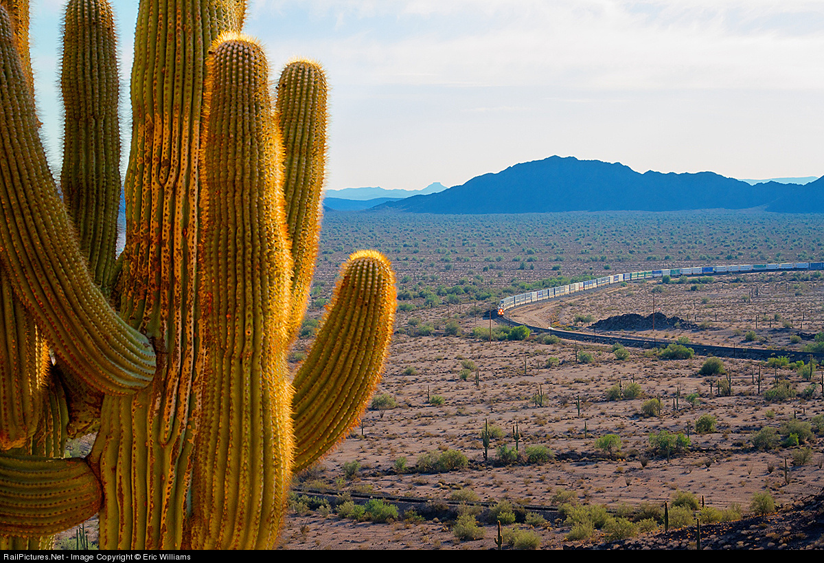 Passing through the Sonoran Desert National Monument, this east bound inter-model is watched by the Saguaro cacti.