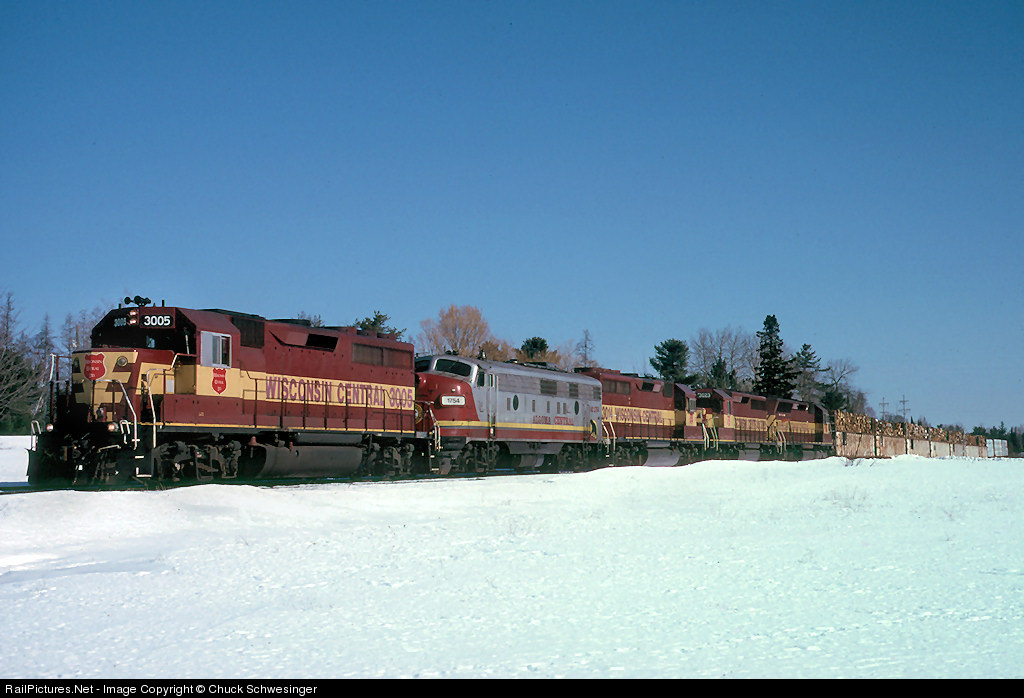 WC 3005, AC 1754, WC 3014,3023,6595 roll SOGBA through Gilchrist with an overpowered 37 car train as spring nears in Upper Michigan. This was the normal location for the AC F's for the few years they were used in freight service between Sault Ste. Marie, ONT-Gladstone. The freight crews didn't appreciate hanging off the side of them during switching maneuvers or the climb up to the cab so they generally were buried in consists if possible.