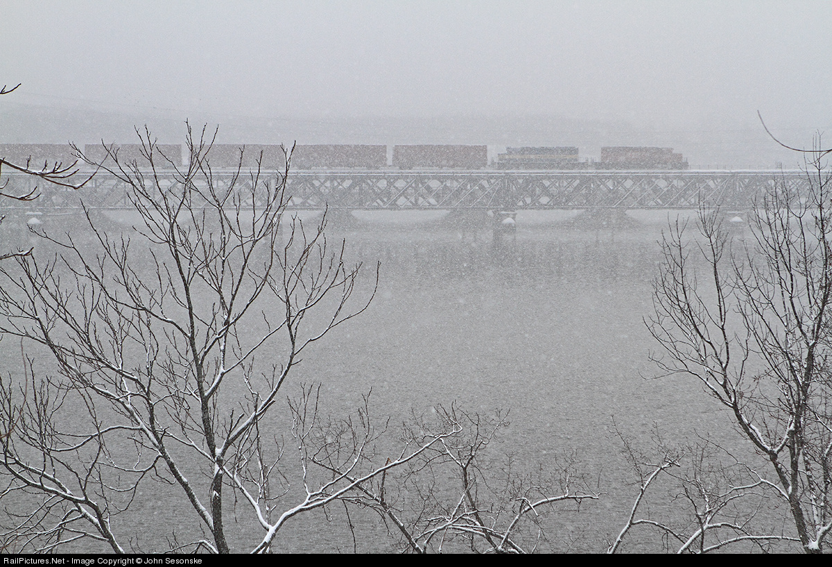 The Saratoga to Kenwood Yard, Port of Albany, NY turn job rolls SB over the Mohawk River with two SD40-2's during the second snowstorm of the week.