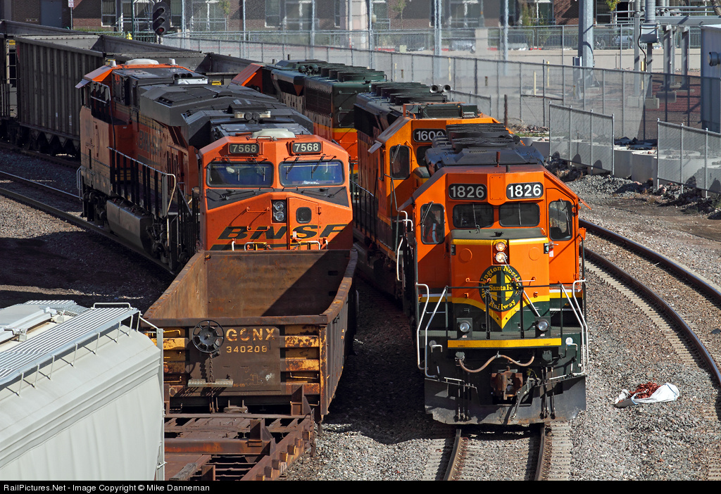 Joint Line meet In a view at Lodo (lower downtown) Denver from the 18th Street pedestrian bridge over Colorado’s Joint Line, a BNSF transfer with a long cut of coal hoppers is meeting a northbound manifest waiting to get into 31st St. Yard. The train is powered by three “Heritage I” SD40-2s; Nos. 1826, 1600 and 1700.