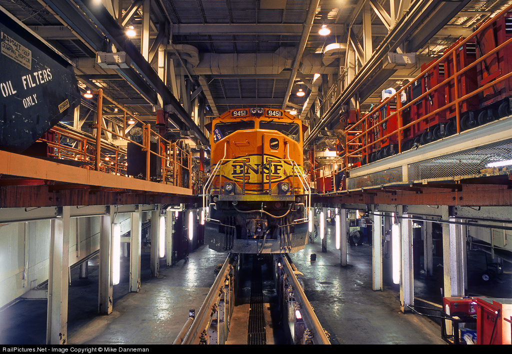 Burlington Northern Santa Fe EMD SD70MAC No. 9451 is in the diesel shop at Alliance, Nebraska, on July 21, 2003. There is plenty of access and light to get the job done on this former “Grinstein”-painted Burlington Northern locomotive, now decked out in BNSF’s “Heritage II” livery.