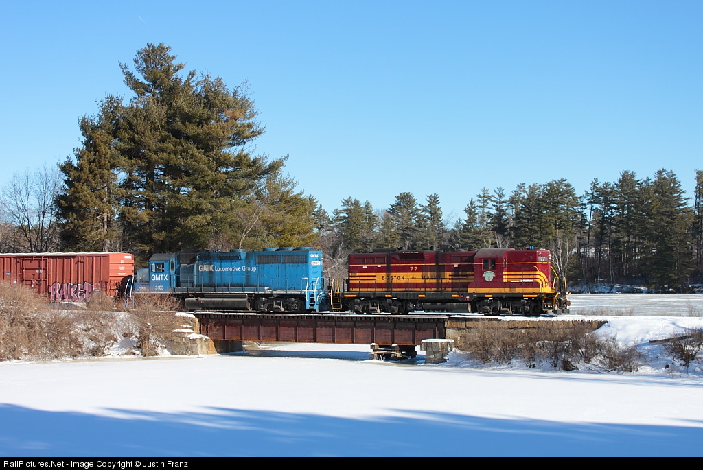 New England Heritage: Pam Am Railways' heritage unit, Boston and Maine No. 77, rolls along the Kennebec River near Hinkley, Maine on Jan. 5, 2013. The locomotive was painted in August 2011 and was joined three months later by Maine Central No. 52. Although the engines rarely leave yard service, they do a great job of recreating scenes of New England railroading's past when they do hit the road.
