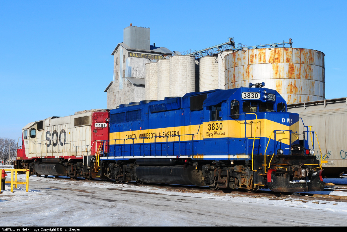 DM&E 3830 and SOO 4401 await their next assignment while sitting in the small yard at New Ulm MN.