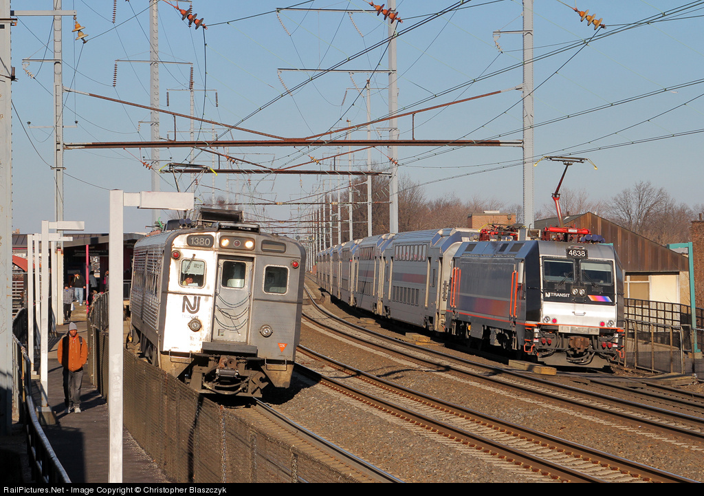 Counterpart NJT New York-Trenton trains meet at Elizabeth as westbound train 3847 departs with Arrow III MU 1380 at the head end while ALP-46A 4638 shoves on the rear of an 8-car New York-bound train 3848.
