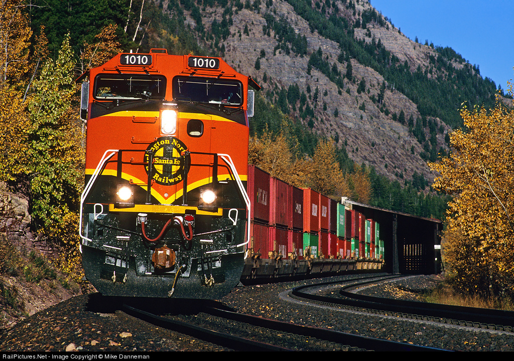 First run of 1010 The second section of Burlington Northern Santa Fe stack train No. 15 is pulled by C44-9Ws No. 1010 and 1009 east of Java, Montana, on Marias Pass on October 8, 1996. This is the first run west for these two new General Electric locomotives painted in a new livery for the BNSF later dubbed “Heritage I” and the fresh paint lights up in the late afternoon sun.