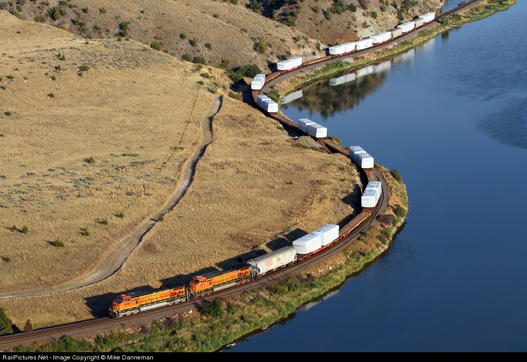 A westbound BNSF wind turbine train is curving through Lombard Canyon west of Lombard, Montana, on September 9, 2011. A pair of turbine generators is loaded on each high-capacity, 8-axle, 70-foot KRL flatcar, with an empty flatcar or covered hopper separating each loaded car to spread the weight on the track structure. These loads must be heavy!