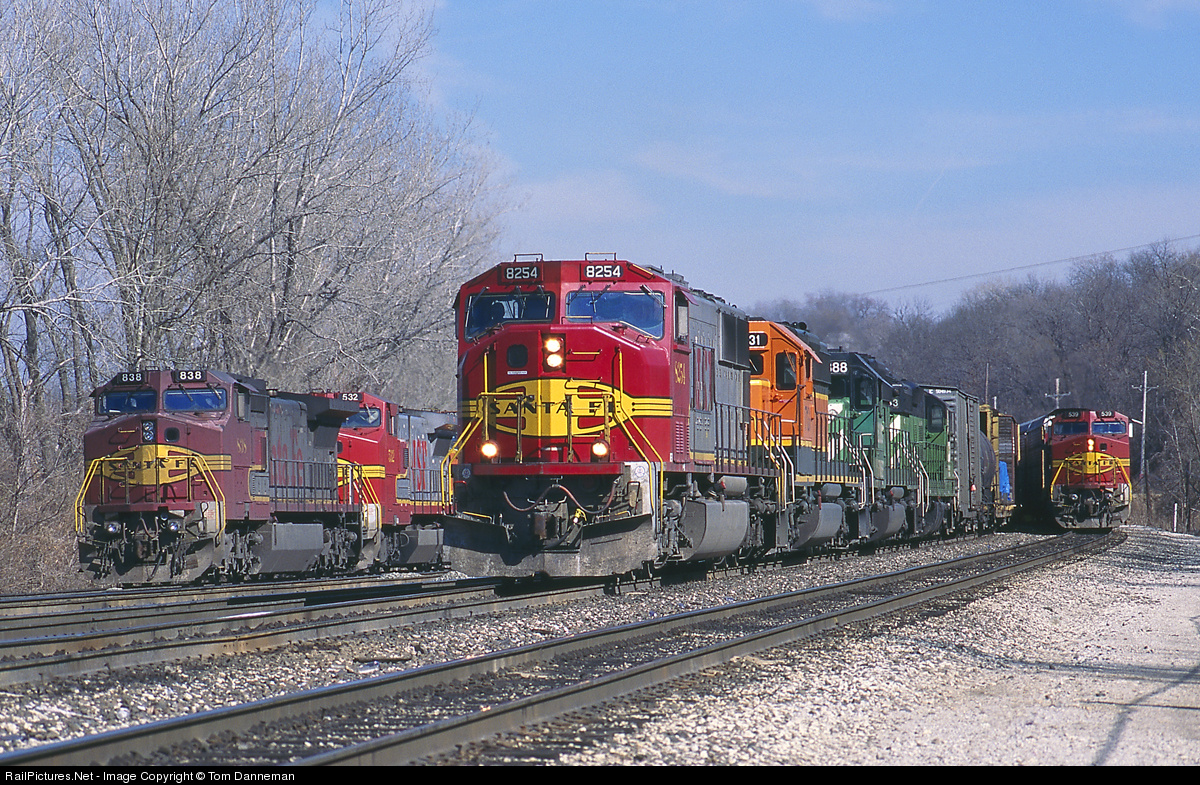 Three BNSF westbound trains, all with Warbonnets of various dirtiness on the point, wait just east of BNSF's Argentine Yard. All three of the Warbonnet's are different models. The manifest freight in the middle also has a Burlington Northern SD9 trailing.