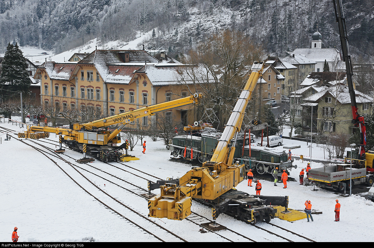 A first attempt to lift the "crocodile" at 10.30 AM failed, because the locomotive was moving around its longitudinal axis. The mounting on the crane had to be done in a different way and the action was successfully then after 01 PM. Locomotive Ce 6/8 II # 14270 left the position, where it stand for 30 years. On the right KIROW KRC 1200 of the SBB for up to 150 tons, on the left "Kran IX" of Vanomag company, a Gottwald product for up to 130 tons.