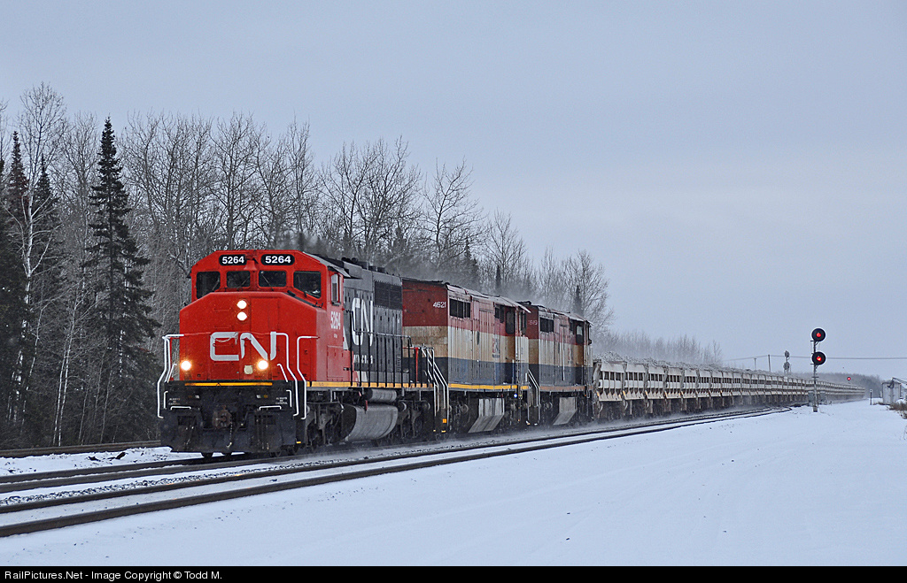 | Still looking good from a somewhat fresh paint job, CN 5264 adds color to the otherwise dreary allbeit interesting lash-up on a NB limestone train for U.S. Steel Minntac. |