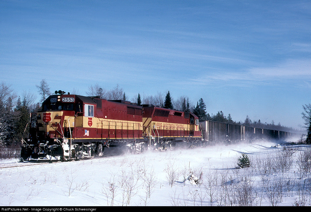 Caffey, Michigan consists of a short siding and a handful of residences, most now used as cabins. On occasion pulp/logs are loaded there for transport west but for the most part the biggest action of the day comes when a train rambles across highway H-40 activating the crossing signals. This is OACTI the empty ore loads from Algoma Steel in Sault Ste. Marie, ONT to Tilden Mine near Palmer, MI making its way west with 2553 and 6619 for power during the WC's last winter.