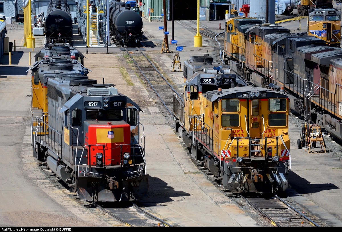 | UP 1517 - a patched unit which still sports the Cotton Belt logo on the side, sits in the UP North Yard with some other veteran units including UPY 1323 (MP15DC) |