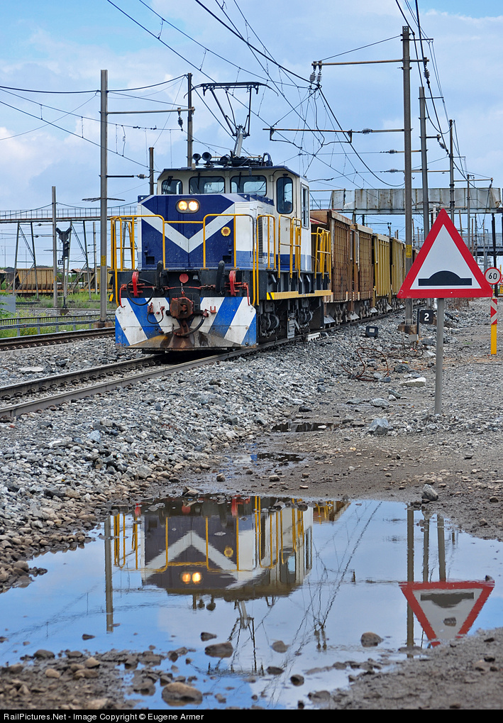 | Impala Platinum is the worlds second largest platinum mine and operates an extensive electrified (3000v DC) rail system serving 14 shafts. After a brief midday summer thunderstorm soaked the area, Impala Platinum's class 8E Bo-Bo electric no.1 heads out to one of the shafts with its train of empties to collect another load of ore. The speed bump warning is for the adjacent road, not for the trains :-)) |