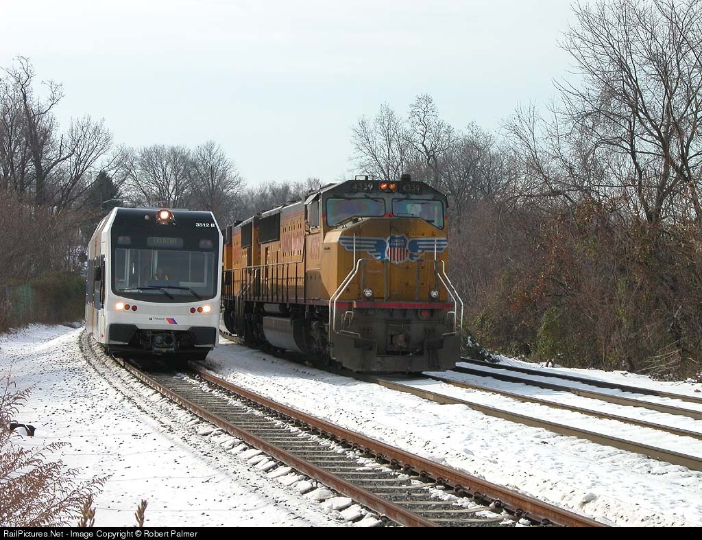 CSX Q418 with UP power is passed by NJ Transit light rail train.