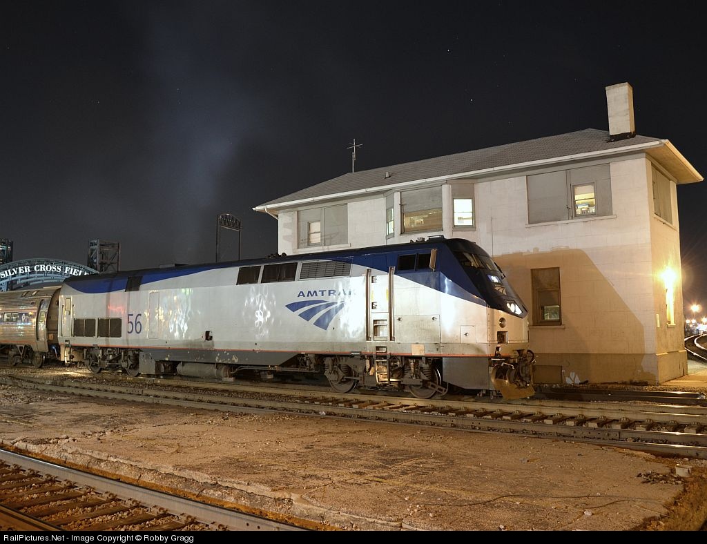 | Amtrak P42 56 sits in front of UD Tower as it makes it stop in Joliet with Lincoln Service 305. UD is scheduled to be closed in the next year or two as the city of Joliet is building a new station east of the diamonds that will cause Metra not to cross the diamonds anymore. |
