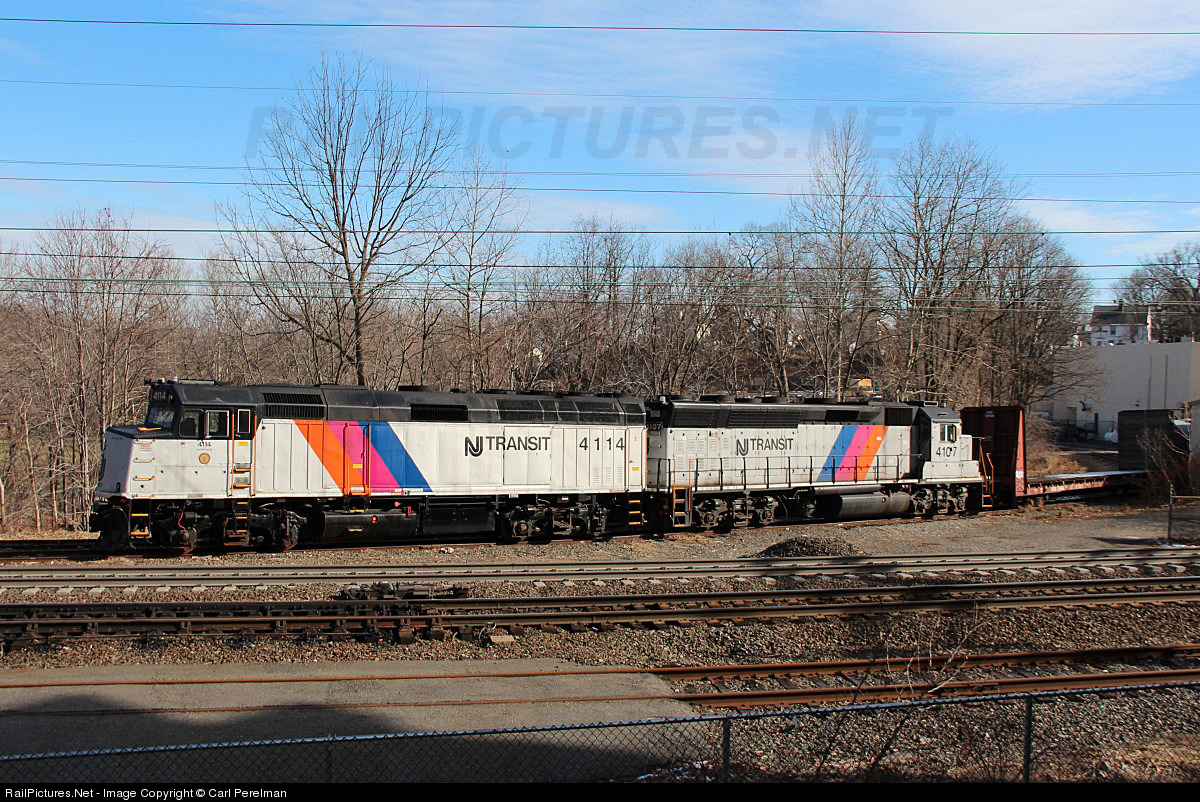 | Two veteran NJ Transit locomotives sit idle at the NJ Transit/M&E Ry. interchange in Morristown. Both units were damaged during Hurricane Sandy and are waiting repair at the M&E's Morristown shop. Behind the 4107 are several empty freight cars waiting for return to CSXT via the Conrail Center Street interchange in Harrison, N.J. |