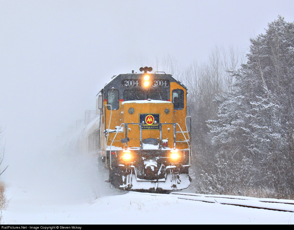 | The best kind of railfanning is when you can walk out your back door and be able to get a snow shot like this. MQT 2004 leads the Ludington yard job eastbound to Walhalla. With a nice over night snow fall and a wind chill hovering around -12, the train running at track speed created a nice white effect blocking out the rest of the 16 car train. |
