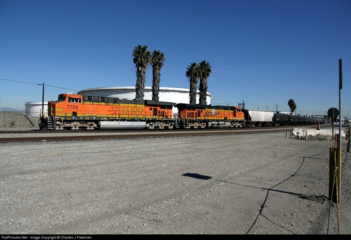 | A BNSF Watson Shuttle job pulls a string of ethanol cars through the Kinder Morgan facility along side the BNSF Harbor Sub. These may have been empties being staged to head back to farm country. |