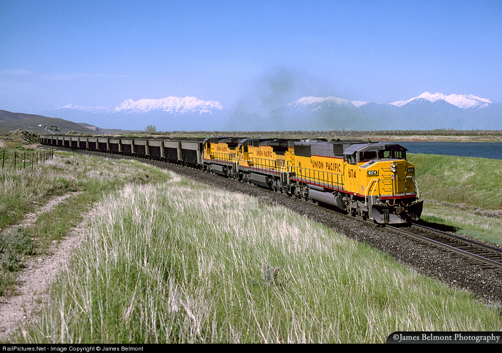 Union Pacific's Wattis Plateau to Intermountain Power coal load grinds its way west on the 1% climb to 5033 ft. York Summit. Summit Creek Number 2 Reservoir (at right) is privately owned and utilized for the irrigation of Santaquin's numerous fruit orchards.
