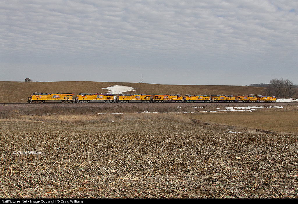 A westbound Proviso, IL, to Fresno, CA, lite power move has 8 ES44-AC44 in consist. UP has been having alot of problems with the Tier 3 ES4400's stuff they have been getting from GE with fuel line fires. UP had parked alot of their 8000's waiting repairs which I believe has started to get these units back in service? Either way this is a long move to get power to the west. 7913, 7990, 8008, 8012, 8037, 7958, 8001, 7975.