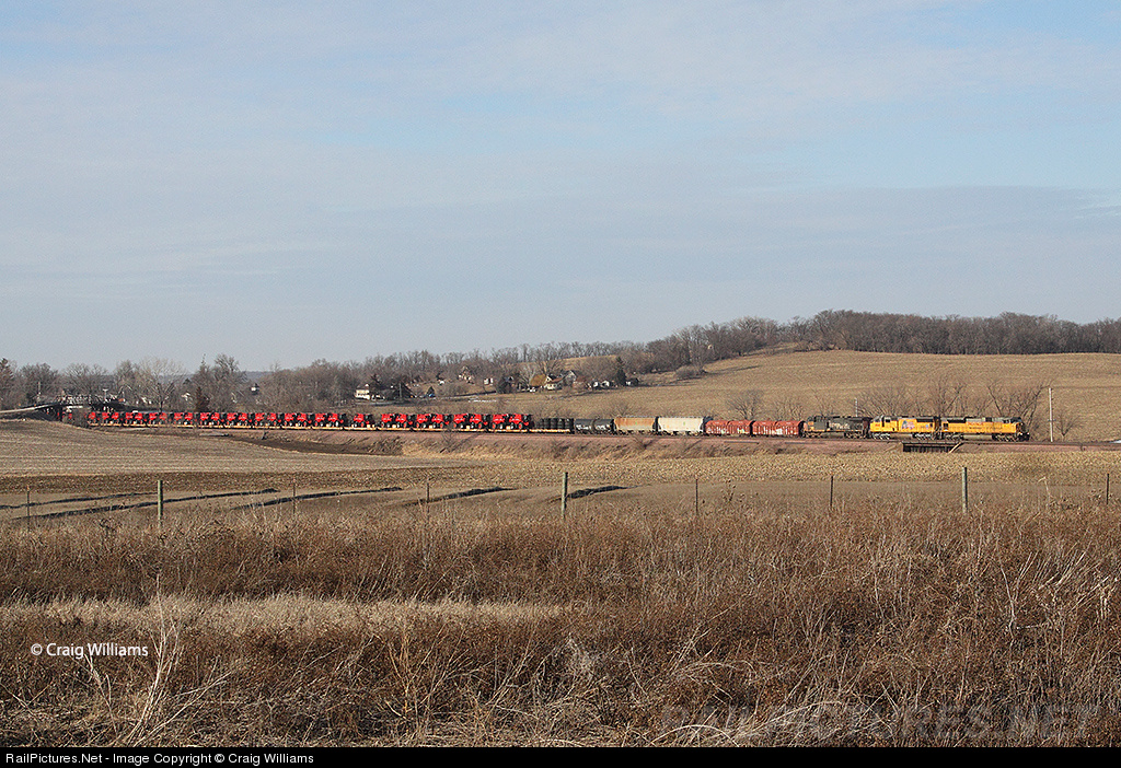 A eastbound Council Bluffs, IA, to Proviso Yard, IL, freight train is just a few miles east of Marshalltown near Le Grand. On the point of CBPR is a block of IH Combines that are made at Grand Island. This train is normally a big land barge that is DP-ed, but today's train is only 10,000 tons and conventional.