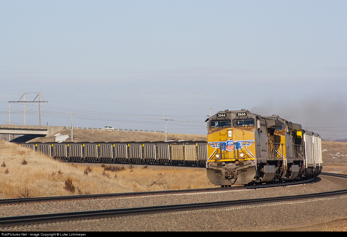 | Rounding a sweeping curve, Union Pacific 5666 prepares to attack the short grade to climb over top the BNSF Railway Hastings Subdivision. The track the 5666 is on is only about 20 years old, the trackage carries Union Pacific's Marysville Subdivision out and around the town of Hastings, Nebraska rather than right through town. |