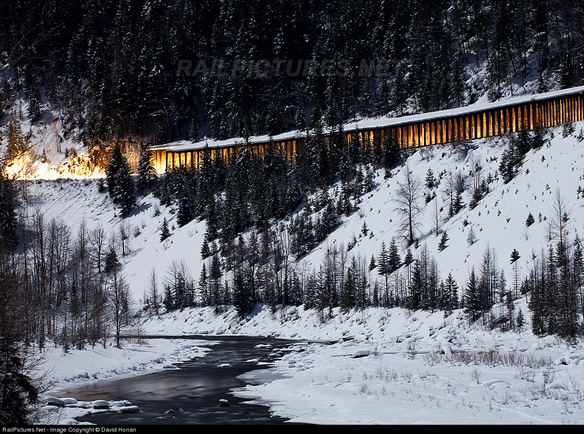 | An eastbound BNSF train grinds up the Marias Pass grade above Essex under a half moon, its headlights bringing light to the otherwise eternal gloom of Shed 12 on the canyon's south wall. |