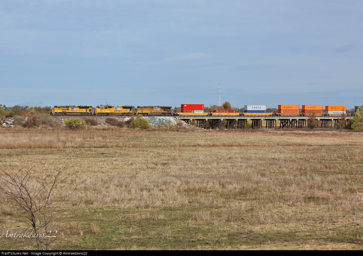 | An SD70ACe leads a huge intermodal train across the Yolo Causeway near Davis, California. Underneath the trestle is the "weir". A weir a large area for water to move through during the winter and spring. Flood control uses the weir to ensure the Sacramento River won't flood. |