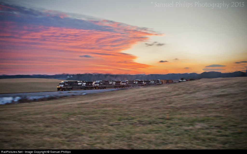 At sunset, Norfolk Southern manifest train No. 186 flies through Goodview, Va., with a heavy train in tow as it traverses the former Virginian Railway toward Altavista. The train has just departed Roanoke minutes before and is en-route to Linwood, N.C., along the former Southern Railway.