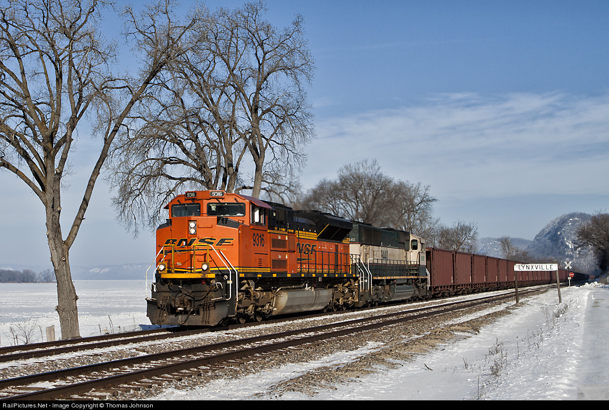RailPictures.Net Photo: BNSF 9316 Burlington Northern Santa Fe EMD SD70ACe at Lynxville, Wisconsin by Thomas Johnson