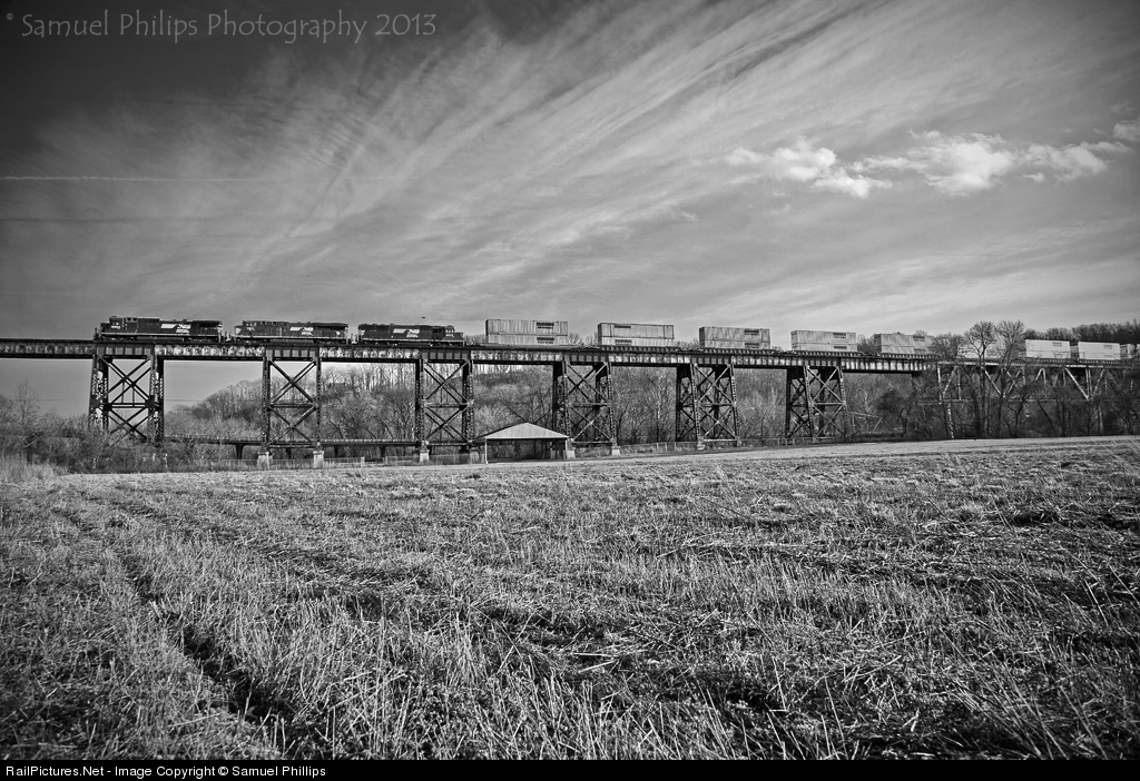 | On a balmy January afternoon, Norfolk Southern intermodal train No. 204 storms across the Staunton River in Altavista, Va., behind a trio of horses; this line was formally owned by the Southern Railway and is currectly referred to as the Danville District. |