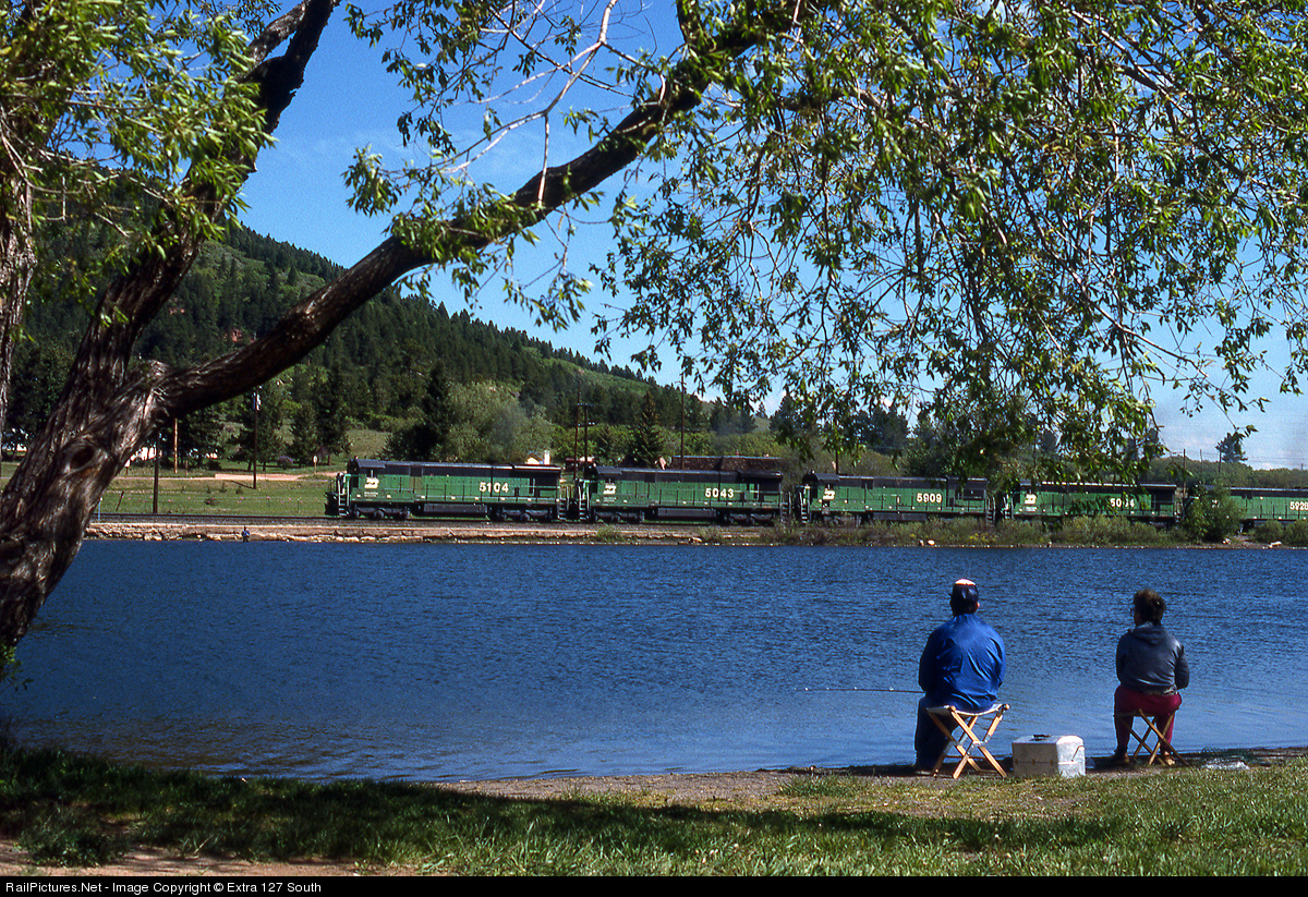 An elderly couple enjoy a beautiful day of fishing as a southbound BN unit coal train passes Palmer Lake on June 4, 1988.