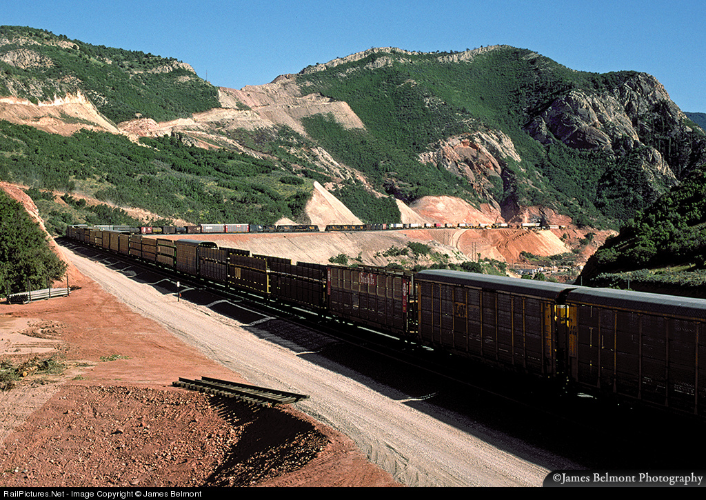 On July 4, 1983, the D&RGW opened a new mainline through the Thistle Tunnel, bypassing the old town of Thistle buried beneath a 300 foot natural dam and submerged beneath a new lake. The first through trains (#178 and #101) are pictured at the west portal of the 3009 ft. tunnel. Highway builders have their work cut out for them relocating US Highway 6 along the north face of Billy's Mountain.