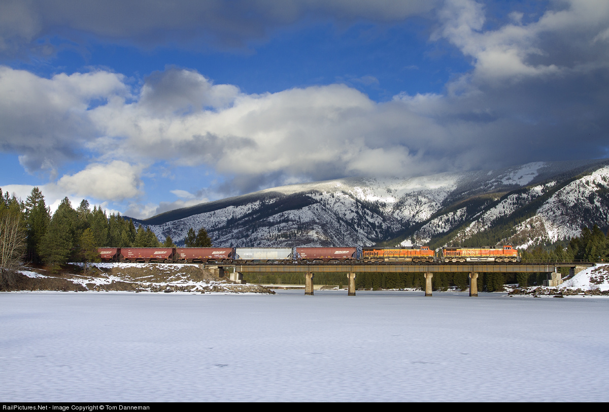 An eastbound BNSF empty grain train rolls across the bridge near milepost 55 on Montana Rail Link's 4th Subdivision just west of Trout Creek, Montana. Lucky for us, the sun broke out shortly before the train arrived. A group of old ice fishing holes can be seen in the foreground ice.