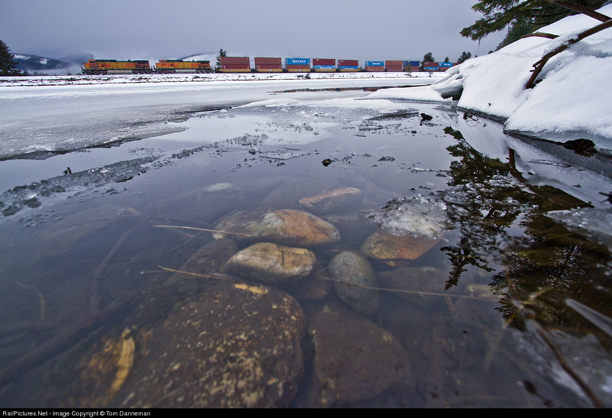 A westbound BNSF stack train skirts the clear and cold Frog Pond west of Trout Creek, Montana. The pond was mostly frozen over, but it did have a few holes of open water like this.