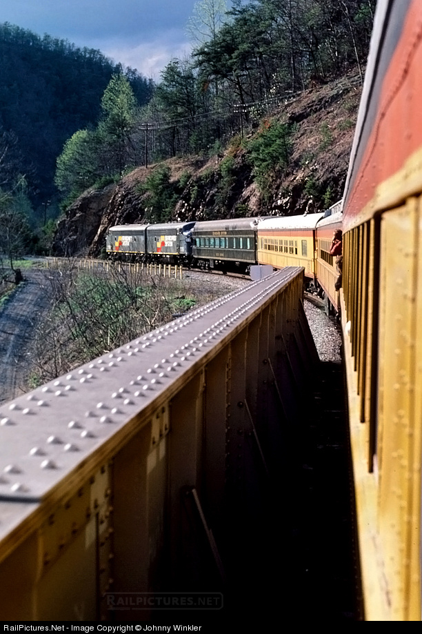 Seaboard System 116 and 118 leading a northbound excursion train through Unaka Springs after crossing the Nolichucky River.