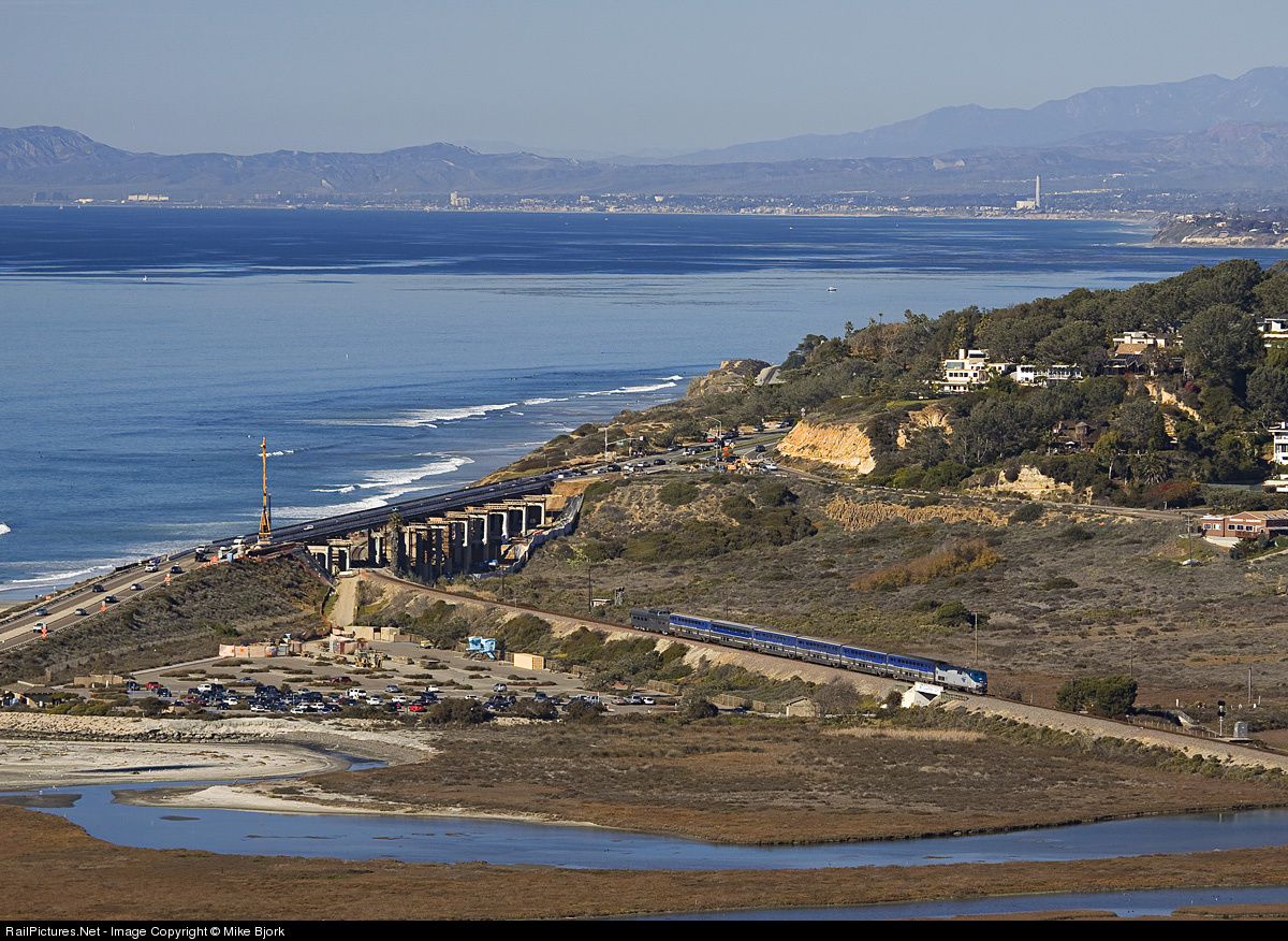 | Built in 1925 by the Santa Fe Railway, the causeway bisecting the Los Penasquitos still serves nearly 50 trains per day at speeds up to 90mph. Amtrak 91 pours on the power to spend a couple miles at 90mph before slowing on the curvy 2.2% grade of Miramar Hill. Bringing up the rear, a CB&Q streamliner brings a little polished steel to the SoCal sun. |