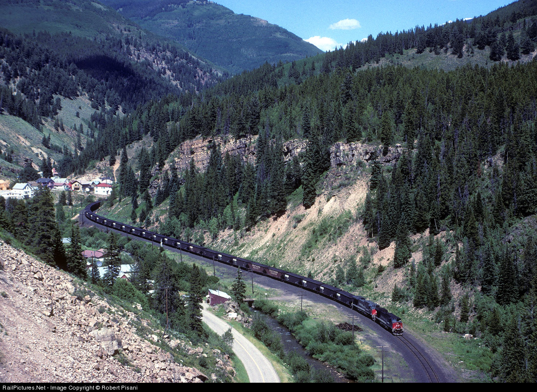 A Geneva, UT bound taconite train rolls down the west slope of Tennessee Pass, passing the small town of Red Cliff with a typical pair of former SP AC's in the lead.