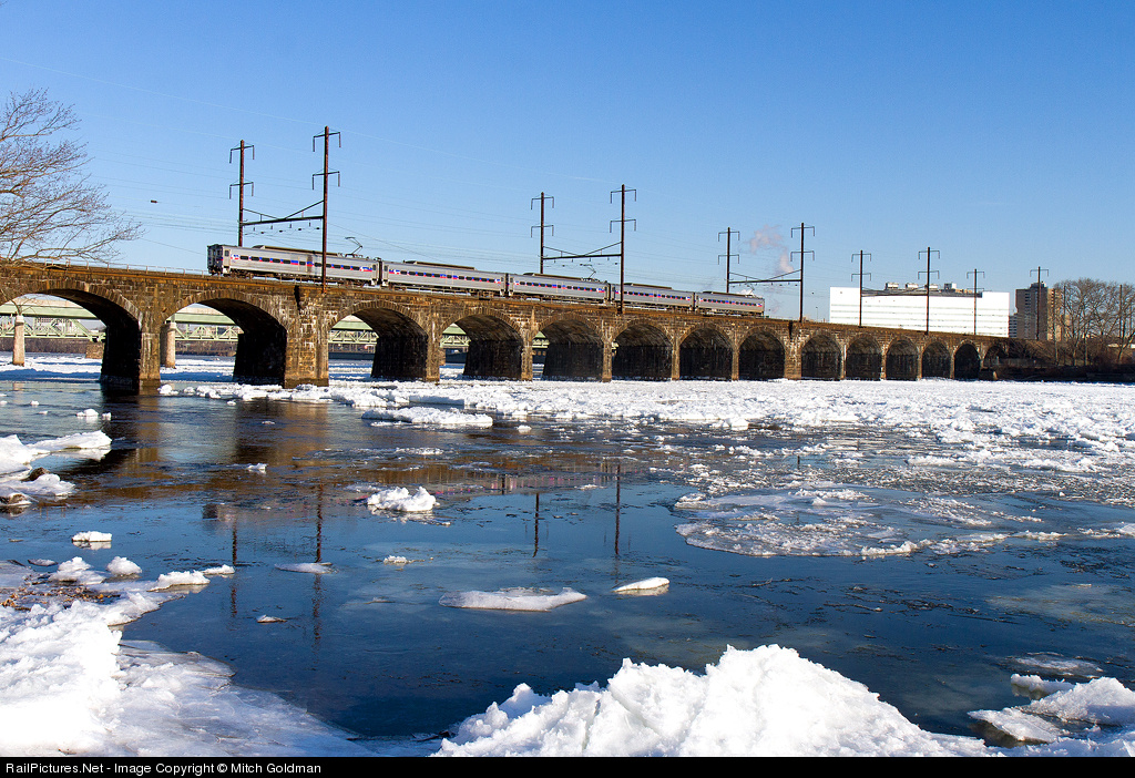 A five car set of GE Silverliners travels over the icy depths of the Delaware River on a crisp January morning.